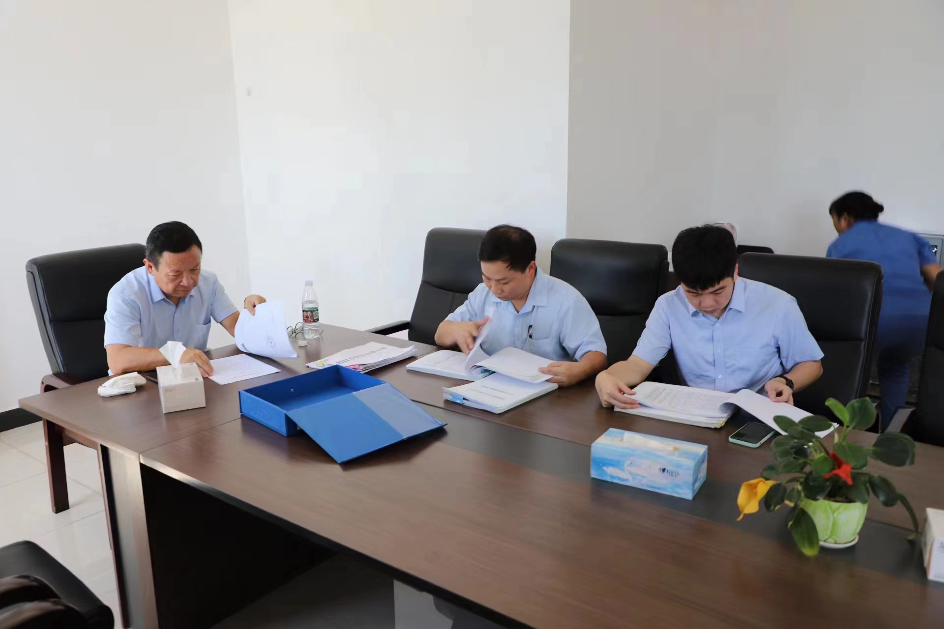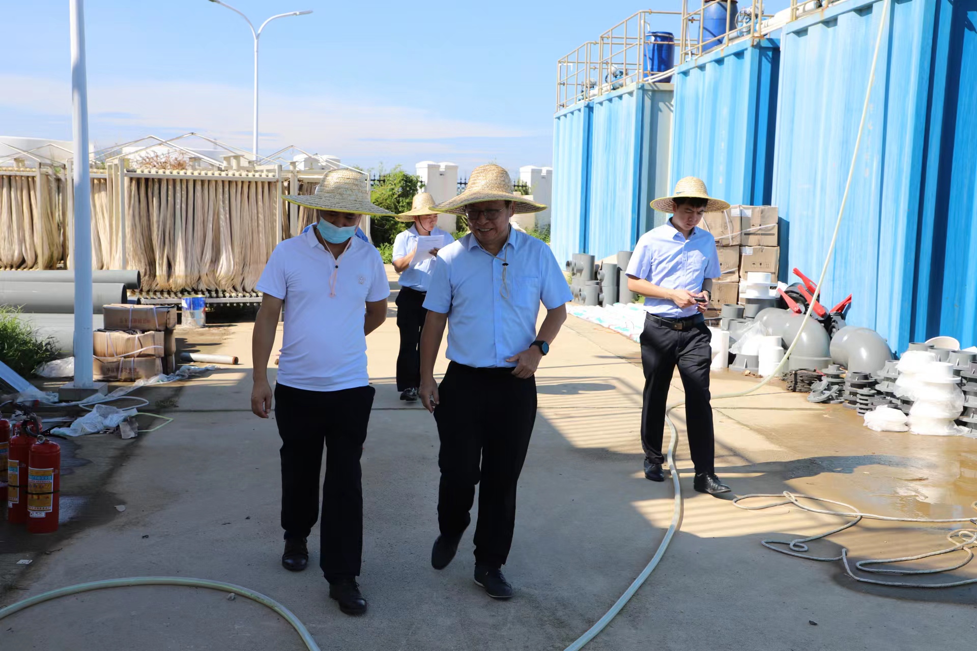 集團總裁趙越等一行先后深入到集團各下屬子公司濱海綜合服務有限公司后勤飯堂、水投公司下屬單位電城污水處理廠、城投公司東灣綠城棚戶區改造項目施工現場、爵山食品公司生產車間、吉達港場平二期施工現場以及水投公司(本部)廠區進行督導檢查。